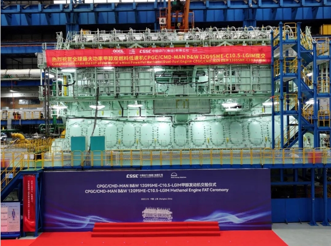 5月15日,中船集團(tuán)旗下中船動力與MAN ES聯(lián)合舉辦的CPGC/CMD-MAN B&W 12G95ME-C10.5-LGIM-EGRTC甲醇發(fā)動機(jī)工廠驗(yàn)收測試(FAT)交驗(yàn)儀式在中船動力下屬中船三井成功舉行。