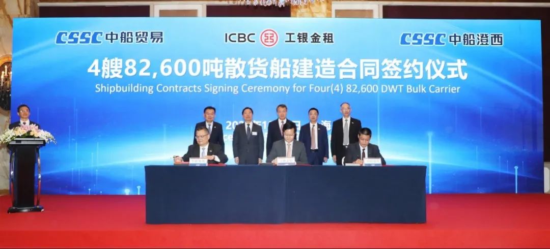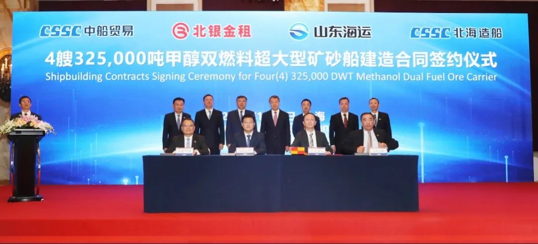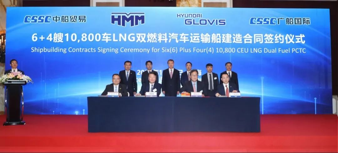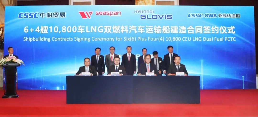 簽約儀式上,外高橋造船、中船貿(mào)易與Seaspan、現(xiàn)代Glovis簽署了6+4艘10800車LNG雙燃料PCTC船項目;廣船國際、中船貿(mào)易與HMM、現(xiàn)代Glovis簽署了6+4艘10800車LNG雙燃料PCTC船項目;北海造船、中船貿(mào)易與北銀金租、山東海運(yùn)簽署了4艘325000噸超?型甲醇雙燃料礦砂船項目;江南造船、中船貿(mào)易與太平洋氣體簽署了3艘99000方VLEC船項目;黃埔文沖、中船貿(mào)易與Benelux公司簽署了2+1艘48000方LPG船項目;中船澄西、中船貿(mào)易與工銀金租簽署了4艘82600噸散貨船項目;大連造船與七二五所青島雙瑞簽署了15000TEU集裝箱船甲醇供應(yīng)系統(tǒng)項目。