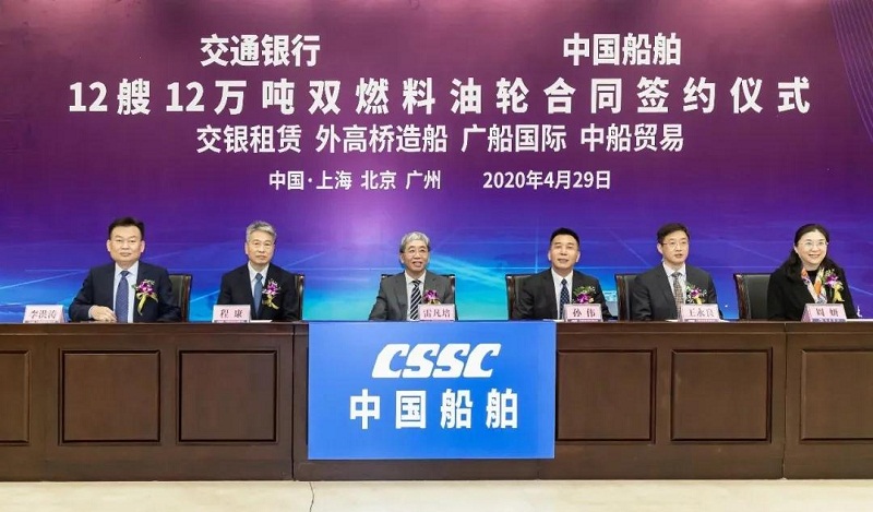 ????4月29日,中國(guó)船舶集團(tuán)有限公司旗下中國(guó)船舶工業(yè)貿(mào)易有限公司、上海外高橋造船有限公司、廣船國(guó)際有限公司與交通銀行股份有限公司旗下交銀金融租賃有限責(zé)任公司在北京、上海、廣州三地以“云簽約”方式簽署12艘12萬(wàn)噸雙燃料油船建造合同,合同總金額約46億元人民幣,這是中國(guó)船舶集團(tuán)旗下單位近期承接的又一單筆大額訂單。中國(guó)船舶集團(tuán)黨組書(shū)記、董事長(zhǎng)雷凡培,交通銀行黨委書(shū)記、董事長(zhǎng)任德奇,中國(guó)船舶集團(tuán)黨組成員、副總經(jīng)理孫偉,交通銀行黨委委員、副行長(zhǎng)呂家進(jìn)出席簽約儀式。