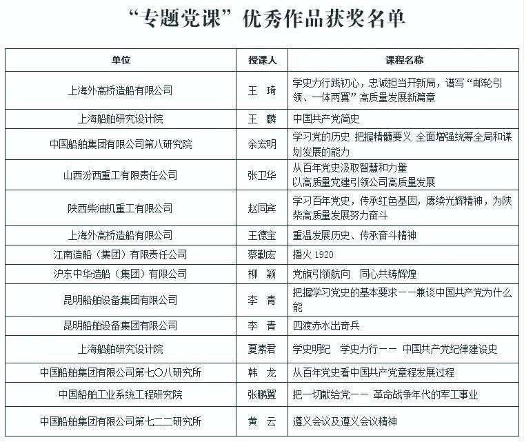 為慶祝中國共產黨成立100周年,深入推進黨史學習教育,由中國船舶集團黨群工作部主辦,中國船舶集團黨校承辦的慶祝中國共產黨成立100周年黨課評選活動結果今天正式揭曉。
